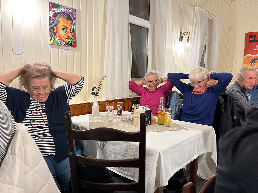 Viele unserer 65 Besucher kamen wie gewünscht in luftiger Kleidung. Es wurde zwischenzeitlich auch schon einmal interaktiv und geturnt; man hat sich dabei gut unterhalten.