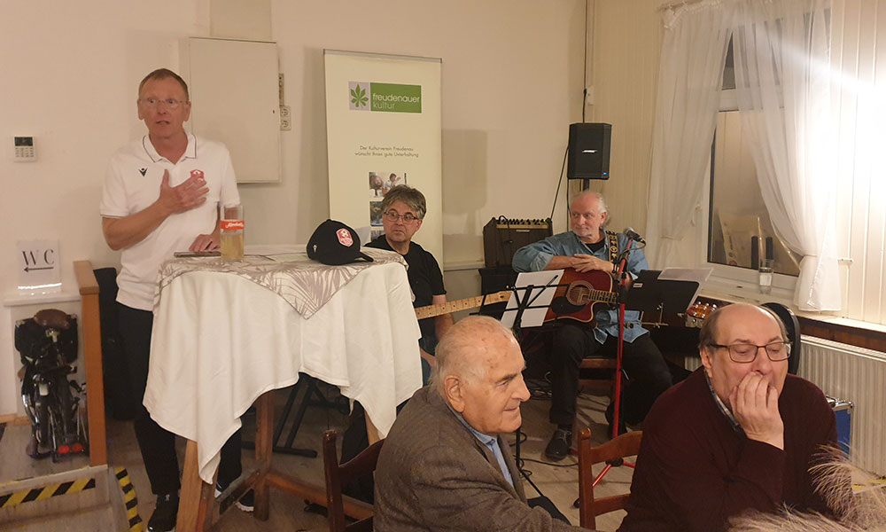 Der Wiener Journalist und Autor Uwe Mauch ist seit Jahren ein großer Fan des Kulturvereins Freudenau und seiner Menschen. Wieder einmal las er im Schutzhaus Heustadlwasser, dieses Mal aus seiner jüngsten Textsammlung. Es geht darin um einen neuen Trend, um Leidenschaft, um soziale Kompetenz, um Empathie, Freundschaft und Fitness im Alter. Es GEHT um Walking Football, eine neue Spielvariante, die Gelenke schont und dem Herzerl guttut.